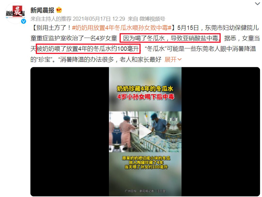 有个奶奶用“珍藏”了4年的冬瓜水给娃消暑。不料,“陈酿”的冬瓜水中,含有大量的亚硝酸盐。孩子喝了一杯后,就进了ICU!