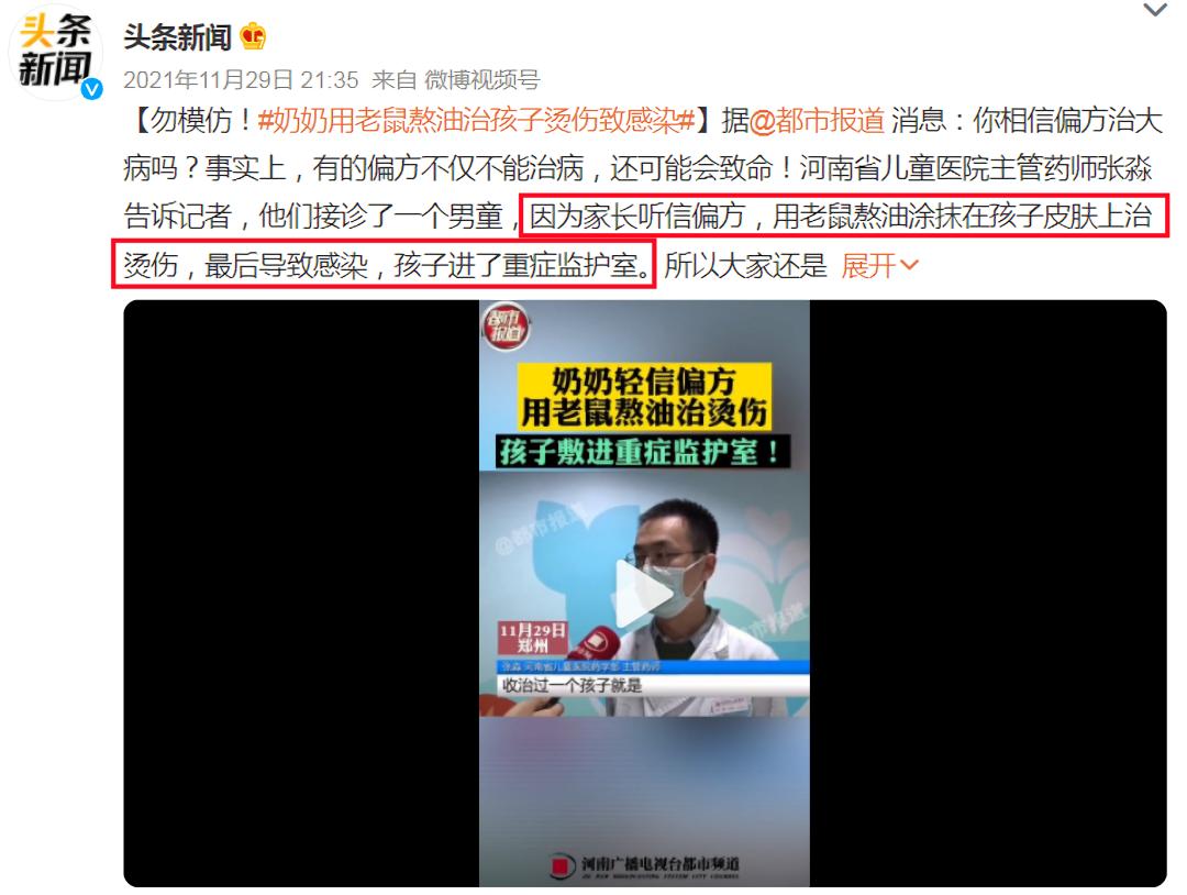 一位老人误信了偏方,用老鼠熬油给孩子治烫伤,导致孩子伤口感染,进了ICU!这样的事,可不少见。此前,广东一名宝宝,因为烫伤,家长用猫毛敷脸,结果猫秃了,孩子脸也烂了。