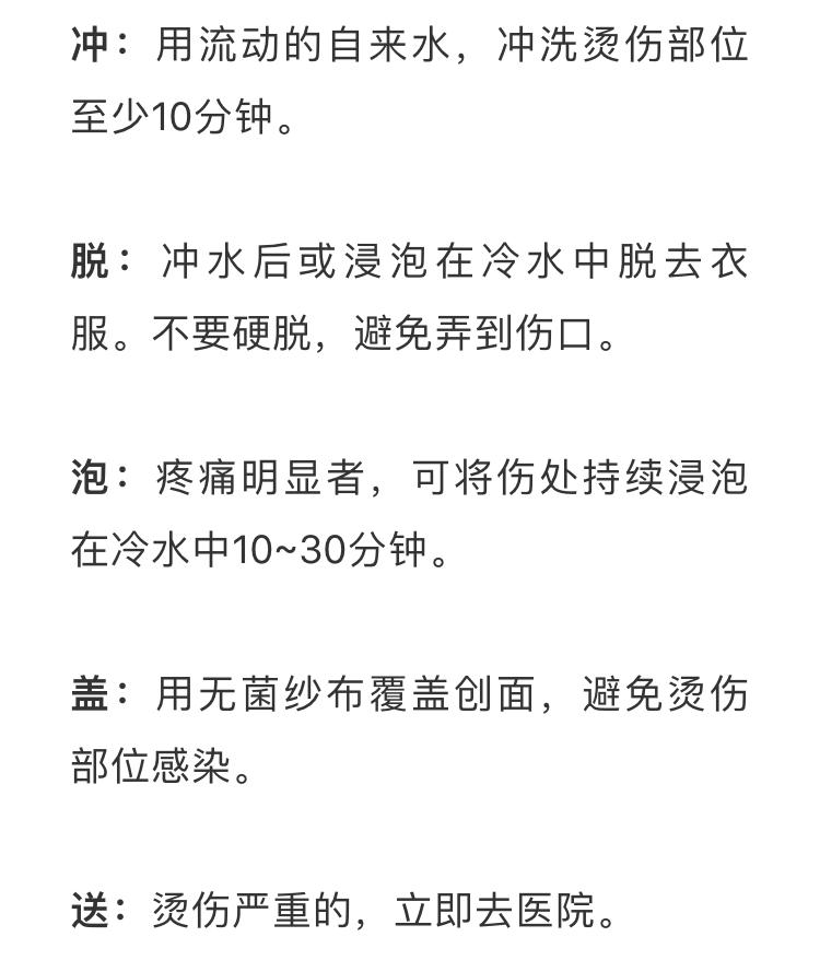 记住,涂牙膏、抹酱油、撒盐巴、涂酒精、擦风油精等烫伤偏方,千万别信。烫伤后,一定要牢记“冲、脱、泡、盖、送”五字口诀。