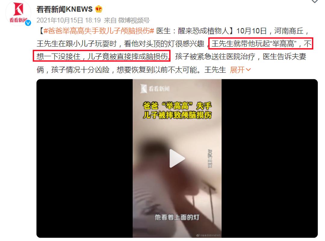 河南一位爸爸跟孩子玩举高高时,一下没接住,孩子被直接摔成脑损伤。医生说,孩子情况十分凶险,想要恢复到以前不太可能。