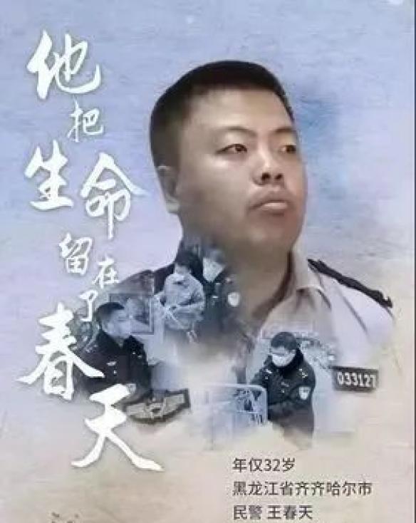 2020年2月11日,农历正月十八,正值新冠肺炎疫情防控期间,一个让人痛彻心扉的日子。市公安局铁锋分局新工地派出所四级警长、副所长王春天与辅警崔红宇,在铁锋区平阳南苑小区执行防疫期间小区封控任务时,因劳累过度,倒在了疫情防控一线,生命永远定格在了32岁。