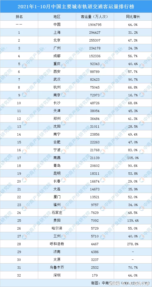 据相关数据统计,2021年1-10月,全国轨道交通客运量累计190亿人次,同比增长44.2%。2021年1-10月,有23个城市轨道交通客运量超1亿人次,4个城市轨道交通客运量超15亿人次。其中,上海轨道交通客运量最大达29.44亿人次,同比增长31.2%。北京、广州排名第二和第三,轨道交通客运量分别为25.53亿人次、23.42亿人次。单月来看,12月份31个省和新疆共完成客运量20.8亿人次,上海共计3.17亿人次。