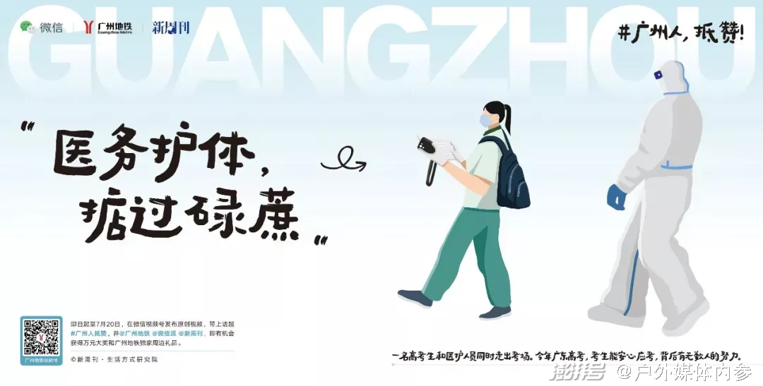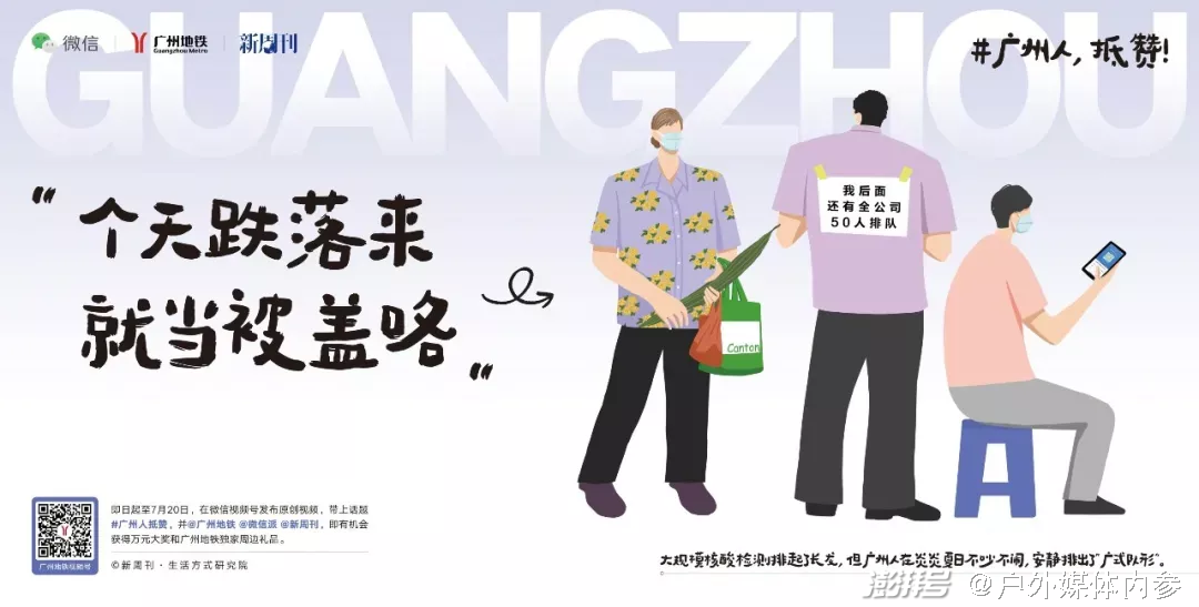 在5月份,广州疫情一度牵动着全国人民的心,但疫情之下的广州人民充满了广式特有的乐观,为此,「微信」联合广州地铁、新周刊旗下的生活方式研究院,走访广州街头,记录疫情下广州人真实的一面,根据这些影像创作了一组主题为「广州人,抵赞」的暖心公益插画。并将这组插画投放到广州地铁里,插画的形式记录了许多熟悉动人的抗疫瞬间,致敬所有此次疫情里认真抗疫的广州人。