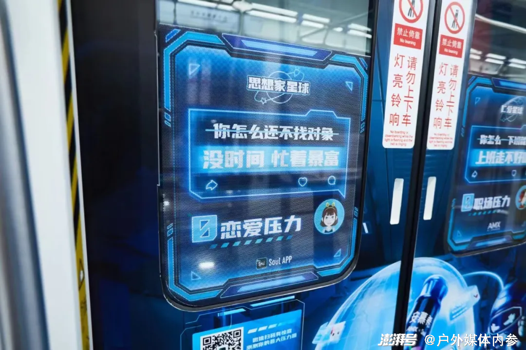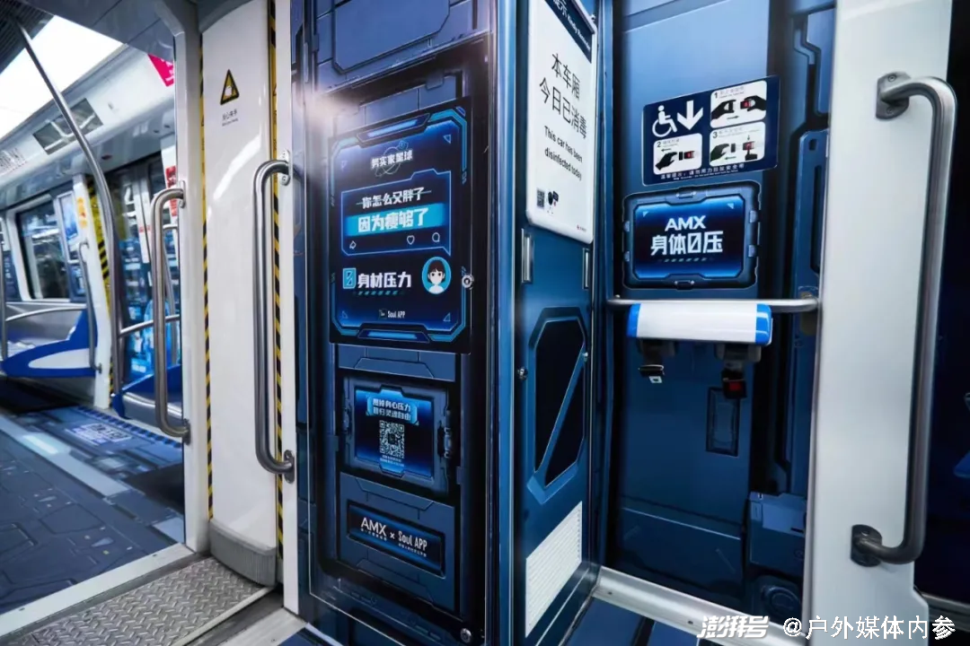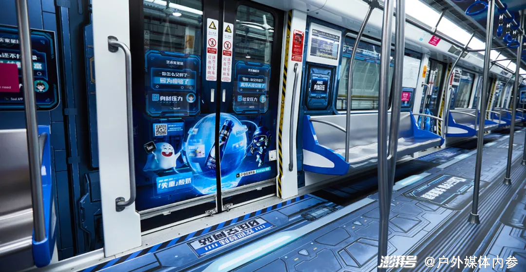 「Soul」在年底与安慕希联名将 0 压空间站搬进杭州地铁6号线,为城市的年轻人们打造了一辆具有未来感和科技感的「0 压专列」。专列内部整体为具有科技感的蓝灰色,整个专列的装扮让人踏入其中仿佛置身元宇宙太空舱,搭乘专列的乘客可扫描车上二维码码开启压力测试,将各种压力尽情甩掉,能感受身心0压的沉浸式体验。