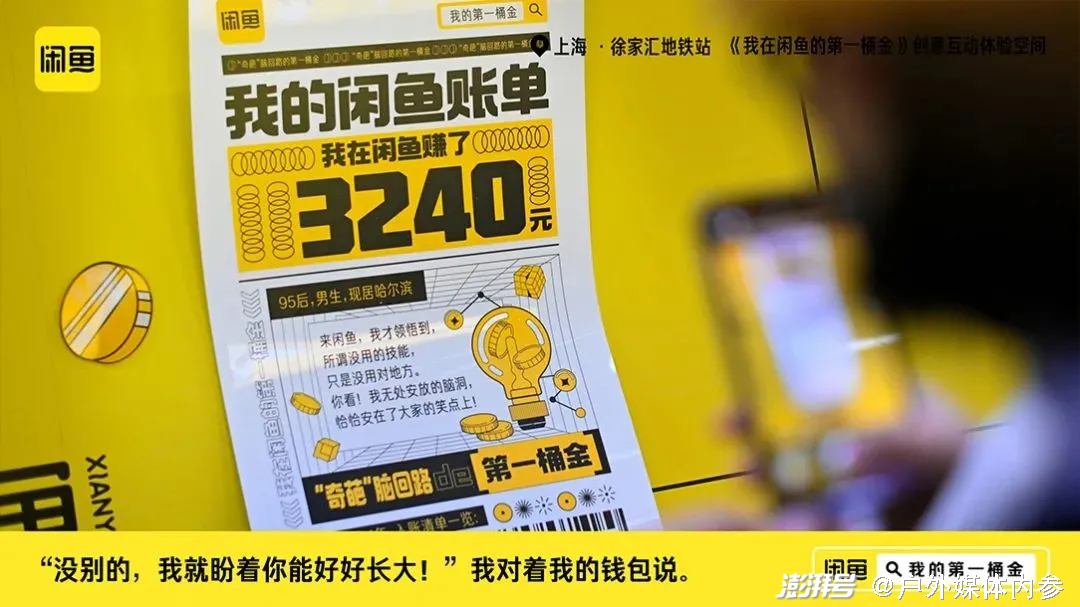 2021年以互动体验式出发的地铁广告案例不在少数,如2月份围绕「闲不住?上闲鱼!」全新品牌主张的「闲鱼APP」打造了「我在闲鱼的第一桶金」的线下事件。品牌方在上海徐家汇地铁站展出了巨幅赚钱账单,上面写满了各式各样不同人群赚取第一桶金的故事。同时在现场打造了“第一桶金到了”的互动体验区,带着不同表情的金桶倒置,里面能听到关于“钱的音效”,乘客可以钻到金桶内去聆听,亦或是打卡拍照留念。