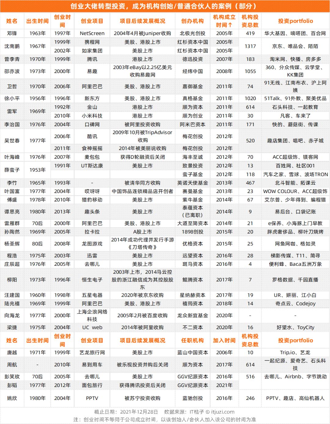 2015 年后拉卡拉创始人孙陶然、去哪儿创始人庄辰超、迅雷创始人程浩等大佬们也开始转型做投资。以及近 2 年,百度元老向海龙离职后,也进入风险投资领域,创办龙众新宜基金。