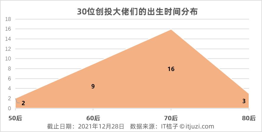 从出生时间来看,上述 30 位创投大佬中,80 后仅有谭思亮(趣头条)、姚欣(PPTV)、杨圣辉(龙图游戏)3 位,超过 16 位是 70 后,包括曾李青(腾讯)、邵亦波(易趣)、卫哲(阿里巴巴)、吴世春(酷讯)等;其余有 9 位是 60 后,如邓锋(NetScreen)、沈南鹏(携程&如家)、雷军(金山、小米);还有最年长的 50 后薛蛮子(UT 斯达康),如今高龄 68 岁了;而徐小平(新东方)如今也有 65 岁了。