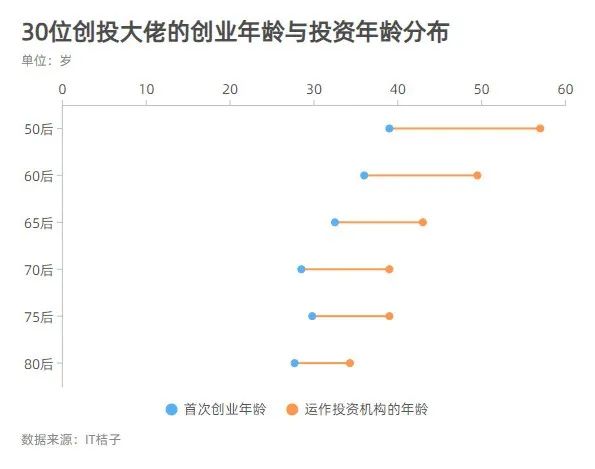 在年龄层面,可以发现创业成功后做投资的大佬们在中间的过程中平均存在着 10 年的时间差;而从 50 后到 80 后,创业开始的年龄和投资年龄均呈现出逐渐变小的趋势。