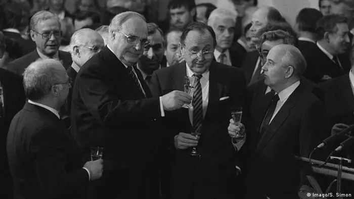 1990年,根舍与时任联邦德国总理科尔在莫斯科签署德国统一协议。图片来源见水印
