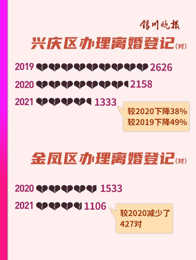 而在金凤区,2021年离婚登记人数为1106对,相较于2020年的1533对,减少了427对。