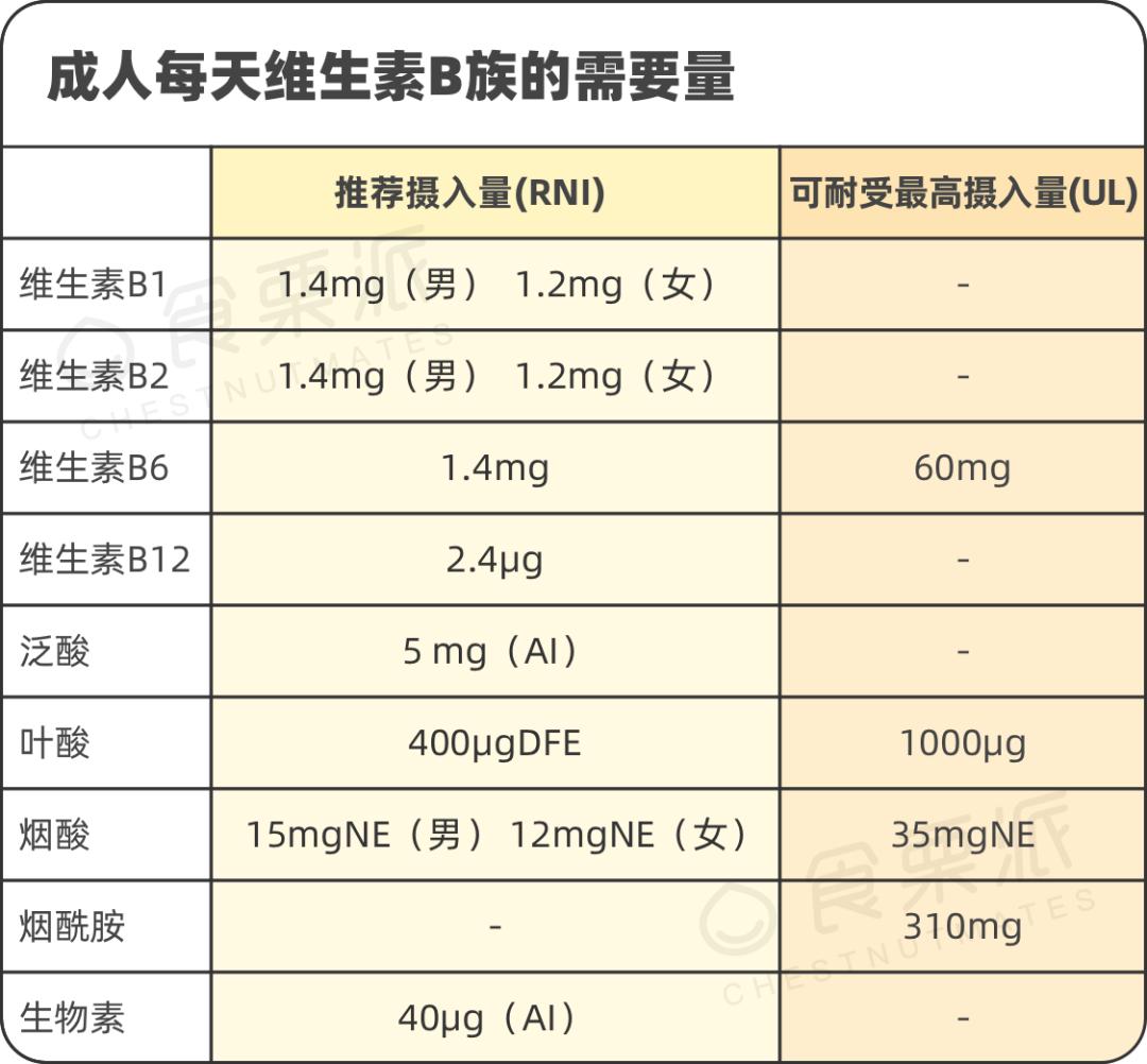 2010~2012年中国居民膳食维生素摄入状况的研究显示[1],维生素B1、B2分别有77.8%、90.2%的人群摄入量低于需要量。��另外,经常熬夜、压力大、喝酒多的人,对维生素B族的需求更大。
