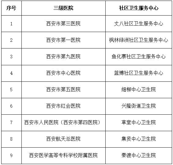 指定市属三级医院9家,对口支援高新区9个社区卫生服务中心(或乡镇卫生院,下同)(对口支援关系见附件),签订对口支援协议,下派内科、外科、妇产科医务人员驻点社区卫生服务中心坐诊,另外由西安市儿童医院、西安市中医医院向丈八社区卫生服务中心、枫林绿洲社区卫生服务中心、鱼化寨社区卫生服务中心、蓝博社区卫生服务中心派中医医师和儿科医师,确保社区卫生服务中心能顺利开展基本诊疗工作。高新区要加强社区卫生服务中心硬件建设,配备必要的检查、检验设备,确保能够完成基本医疗所必需的检查和检验项目。支援医院与社区卫生服务中心建立上下转诊关系,对超出社区卫生服务中心诊疗能力的转往上级医院进一步诊治,支援医院应采取预约门诊、绿色通道或预留床位等方式做好支持。