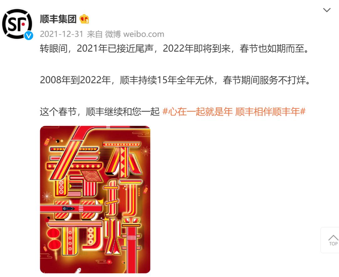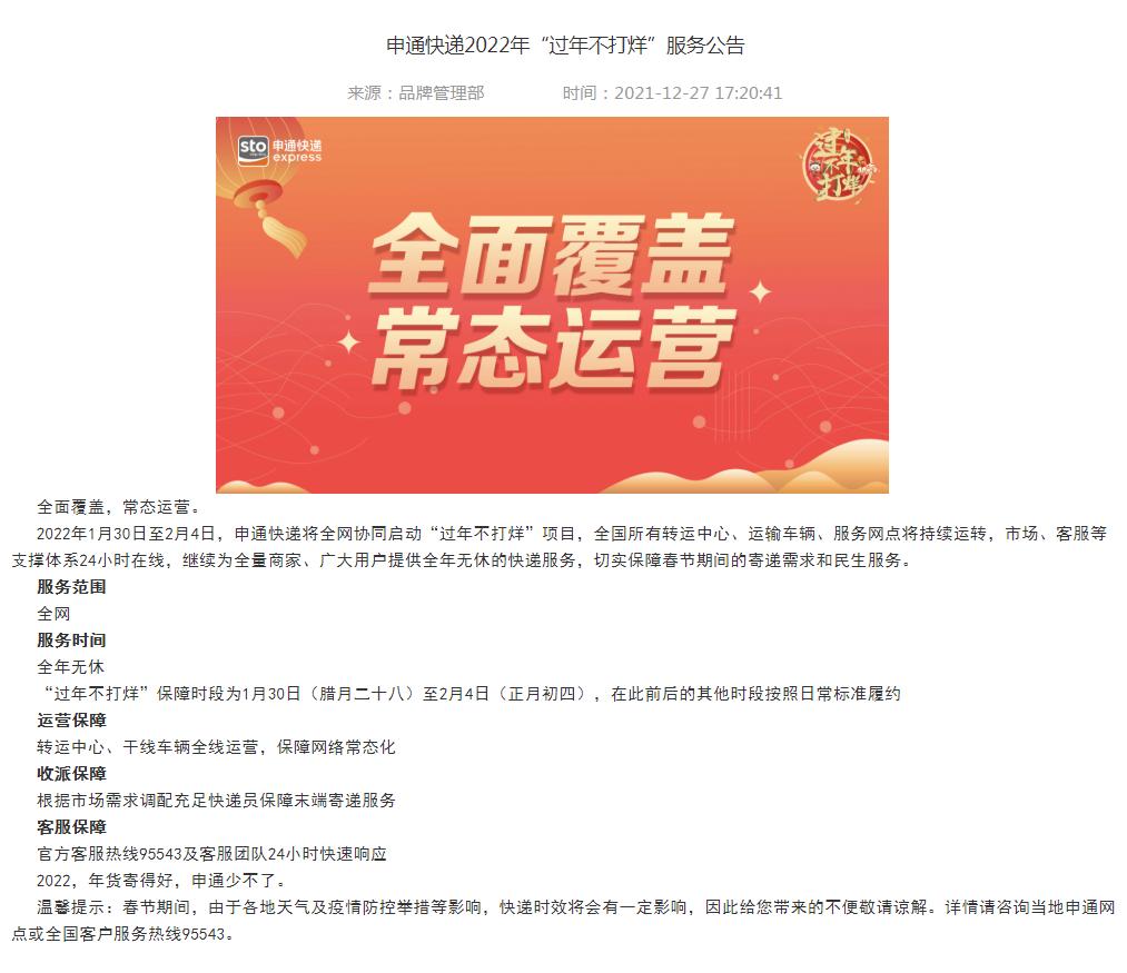 申通快递官网明确,2022年“过年不打烊”,承诺全年无休。
