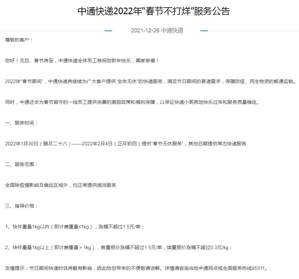 中通快递同样通过官网明确2022年“春节不打烊”,其将在2022年1月30日(腊月二十八)至2月4日(正月初四)提供“春节无休服务”,其他日期提供常态快递服务。