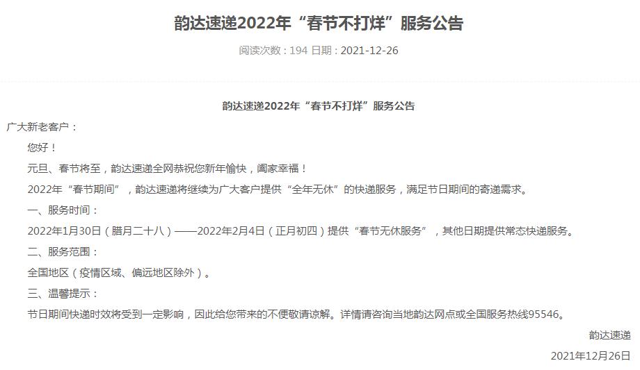 韵达速递官网也明确“春节不打烊”,将在2022年1月30日(腊月二十八)至2022年2月4日(正月初四)提供“春节无休服务”,其他日期提供常态快递服务。