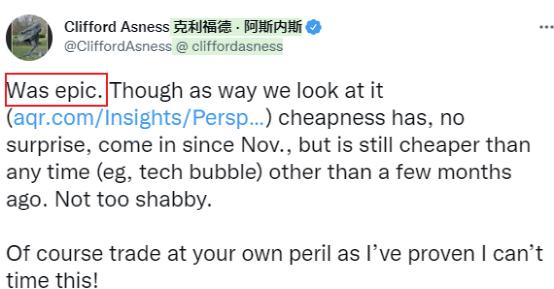 公司联合创始人阿斯内斯在社交媒体上公开表示,上周的表现绝对是史诗级的。阿斯内斯在指出,在2021年许多策略表现强劲之后,他对2022年开局的出色表现感到鼓舞。