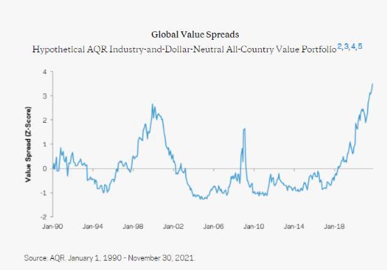 AQR构建的价值与成长要素之间价差在去年就开始上涨