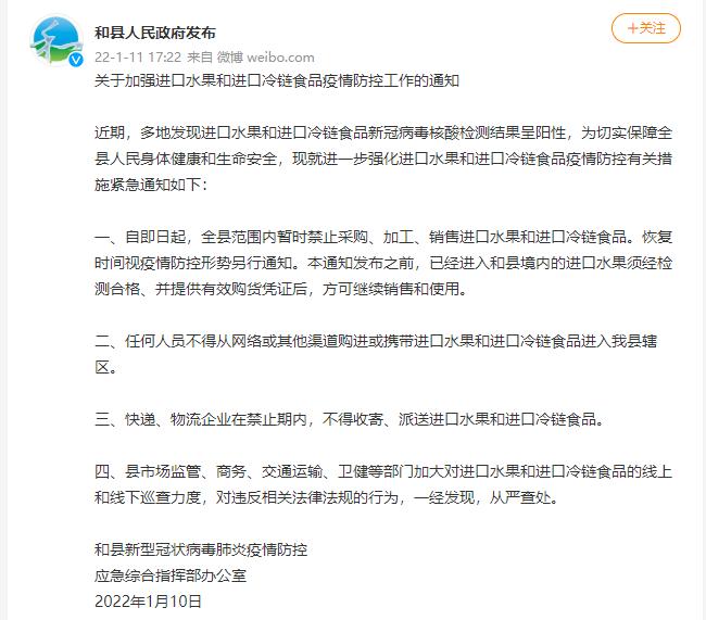 自即日起,和县范围内暂时禁止采购、加工、销售进口水果和进口冷链食品。恢复时间视疫情防控形势另行通知。本通知发布之前,已经进入和县境内的进口水果须经检测合格、并提供有效购货凭证后,方可继续销售和使用。同时,快递、物流企业在禁止期内,不得收寄、派送进口水果和进口冷链食品。