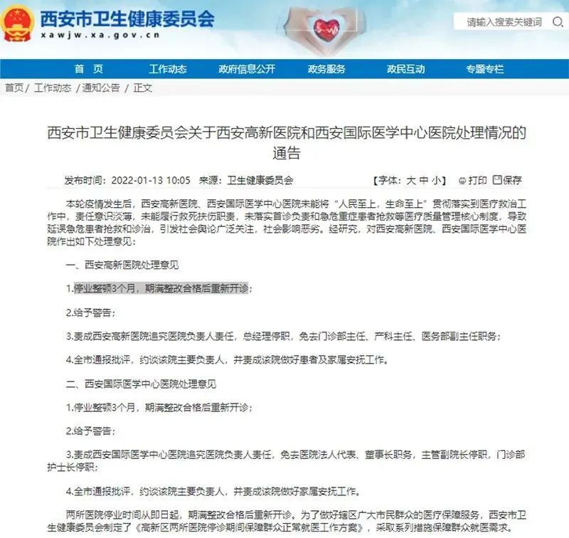 1月13日,西安卫健委通报西安高新医院、西安国际医学中心医院处理情况。通报称,要求西安高新医院和西安国际医学中心医院停业整顿3个月,期满整改合格后重新开放就诊。并对两家医院全市通报批评,免职多人。