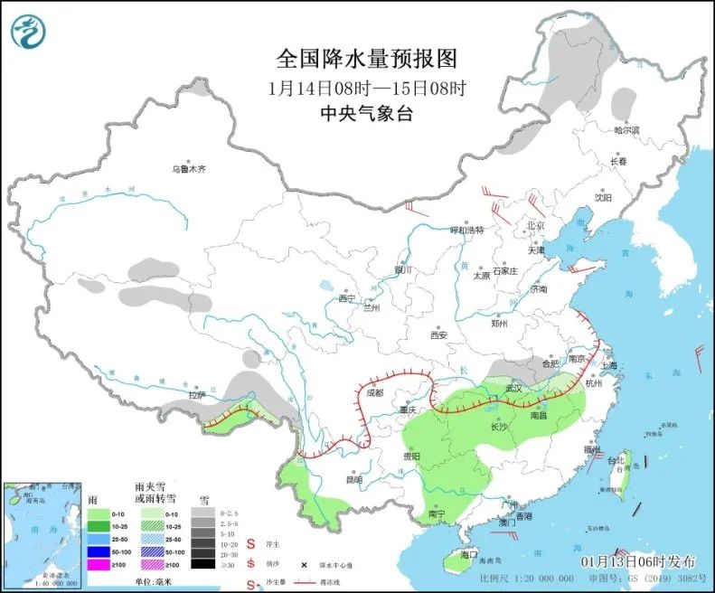 1月14日08时至15日08时,内蒙古东北部、黑龙江西部、西藏东南部、安徽中部、湖北东部等地部分地区有小雪或雨夹雪。西藏东南部、湖北南部、湖南大部、江西大部、贵州中东部、广西大部、海南岛、台湾岛东部等地部分地区有小雨。