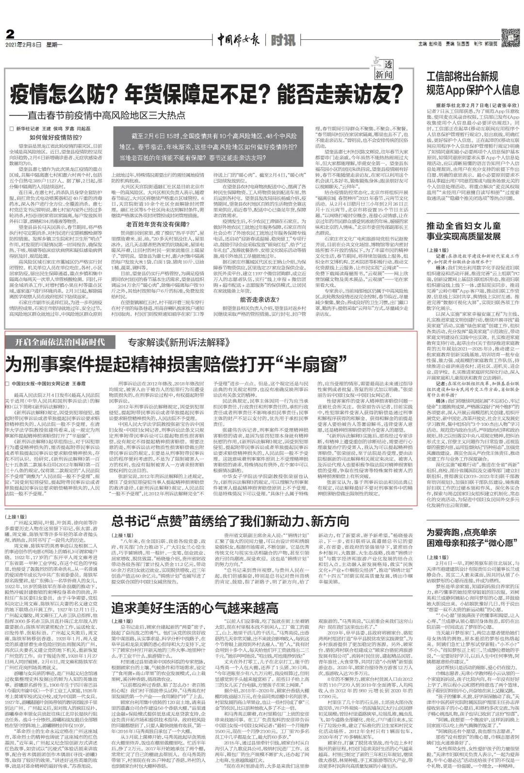 中华女子学院法学院副教授张荣丽也认为,《新刑诉法解释》的规定,可以理解为刑事案件被害人提起精神损害赔偿原则上不予受理,但是特殊情况下可以受理。“具体什么属于特殊的,应当受理的情形,需要最高法未来通过指导性案例或者批复、答复的形式加以明确。”张荣丽告诉中国妇女报·中国妇女网记者。