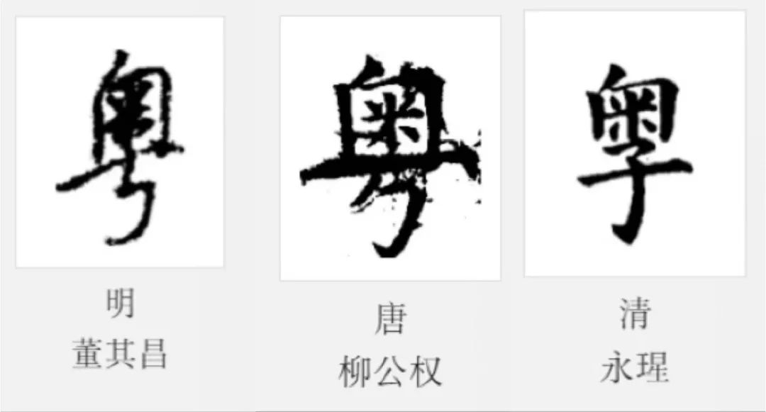 汉字书写是十分个性化的过程,一撇一捺、一横一竖都体现了书写者自身的审美情趣。汉字字形也会随书写者本人的意愿改变,甚至为了美观还会有缺笔的情况出现,不同形态的“粤”就说明了这一问题。