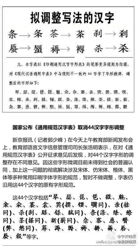 为了更好地推广规范汉字,国家曾出台《通用规范汉字表》。汉字字形也一直在汉字推广过程中备受关注。2009年时,教育部发布过《通用规范汉字表》(征求意见稿),其中提到了对44个汉字字形微调的意见,如要将“琴”左边的王最下面的横改为提,“唇”改为上下结构,“杀”中的竖钩改为竖等。征求意见稿发布引起了网友们的热烈讨论。