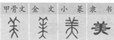 许多人会把它写成一撇到底,其实不是。最早的“美”,样子很像是一个带羊角装饰物的人。美的本意是味道好,《说文解字》写道:“美,甘也。从羊,从大。羊在六畜主给膳也。美与善同意。”
