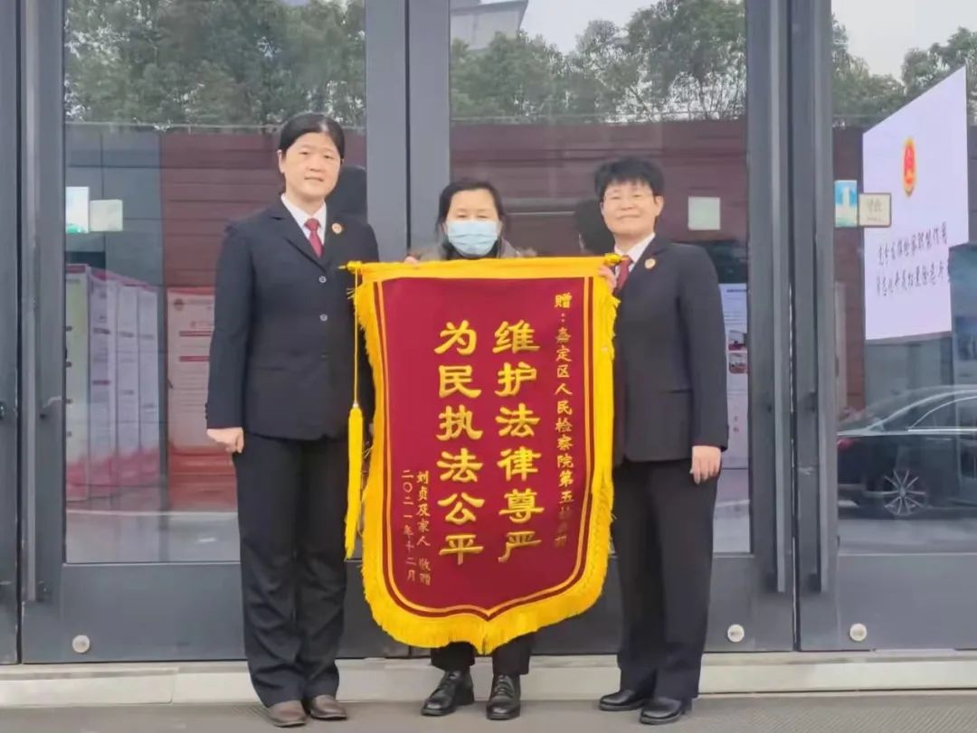 “我真心感激你们,在我走投无路的时候帮助我,谢谢你们为我们老百姓办事,谢谢,谢谢!”日前,张阿妹(化名)拉着嘉定区检察院第五检察部检察官金娟娟的手,哽咽着将锦旗交给金娟娟,锦旗上面写着:维护法律尊严,为民执法公平。
