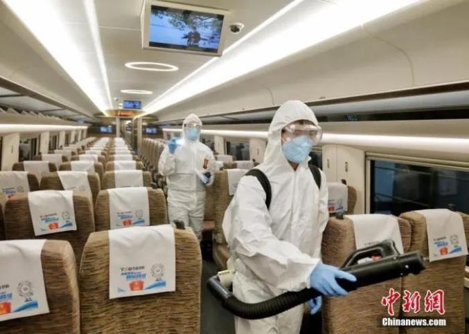资料图:防疫工作人员对每节车厢进行消杀处理。