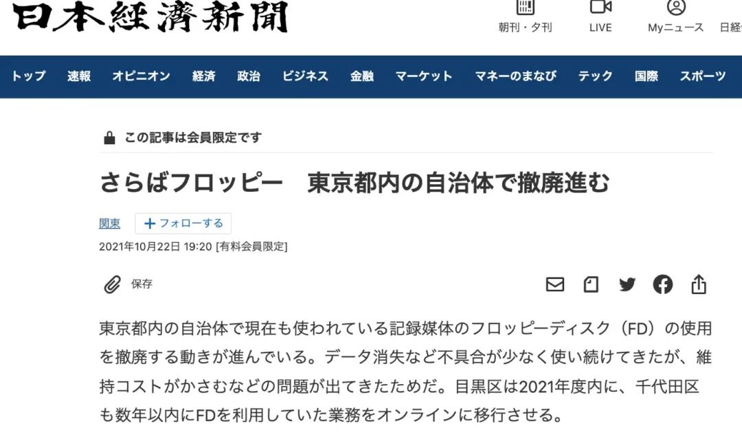 可事实上,日本的政府机构依旧在广泛使用软盘。2021年的10月22日,“日经新闻”居然还在报道说东京都内各大行政机构正在减少使用软盘。