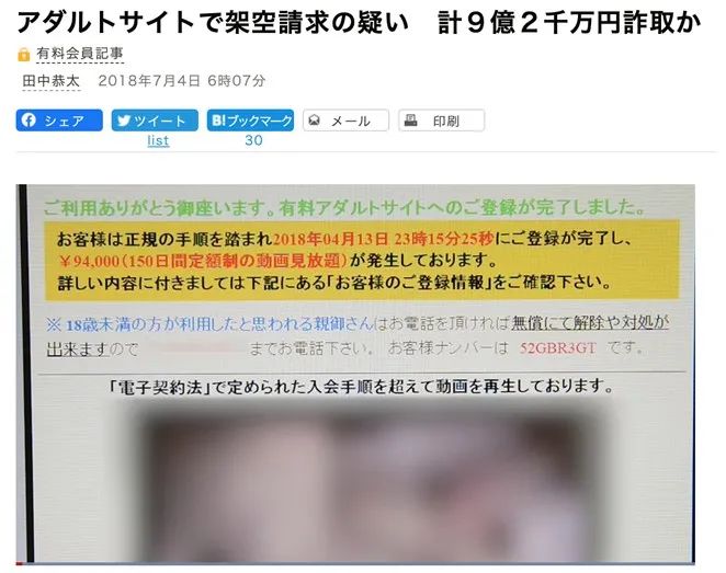 至于单个个人,京都新闻报道了一个例子——有一名78岁高龄的大爷被这种成人网站诈骗框住,给骗子打了435万日元(约25万元人民币)。想必大爷以后打开羞羞内容的时候都有极大的心理阴影了。