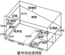 壁球场是一个四面有壁的房间,场内禁止有凸出物。国际壁联所规定的标准场地分为单打和双打两种。单打场长9.75米、宽6.4米、高5.53米,双打场地长13.72米、宽7.62米、高6.1米,加上顶和地面共6个面(顶和地面在质量上应和四壁相似)。后墙一面墙为玻璃钢墙,以便观众观赏、教练指导。门一般开在后墙中间。美国的壁球场地要小一些,它的宽度仅有5.64米、高4.88米。