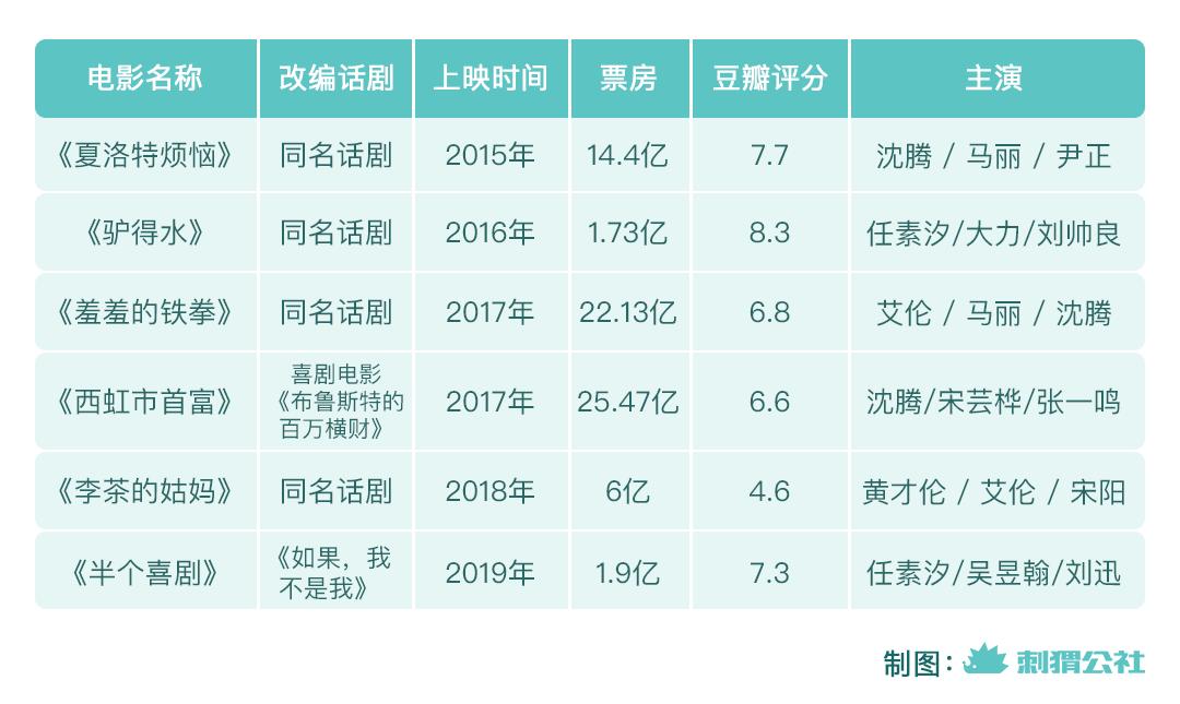 2018年,开心麻花的IPO之路受阻之后,成熟话剧改编电影也开始“翻车”。话剧《李茶的姑妈》改编成电影之后,口碑下滑。自此,麻花对于电影改编更为谨慎。不仅仅是小剧场走向大银幕举步维艰,由麻花参投或麻花签约艺人主演的电影口碑与情怀各异。