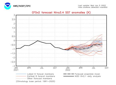 CFSv2预报2022年春季还会降一峰,表明当前拉尼娜事件在大气条件上仍未达到顶峰状态,并在今年上半年成为为反锁相拉尼娜事件。但是汤加海底火山的爆发是可能促使拉尼娜转向厄尔尼诺的,具体情况还得观察