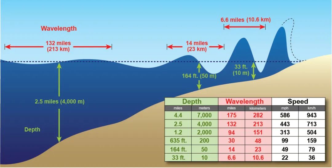 海啸的横截面,其长波穿过海洋并在接近海岸时进行压缩。来源:美国国家海洋和大气管理局