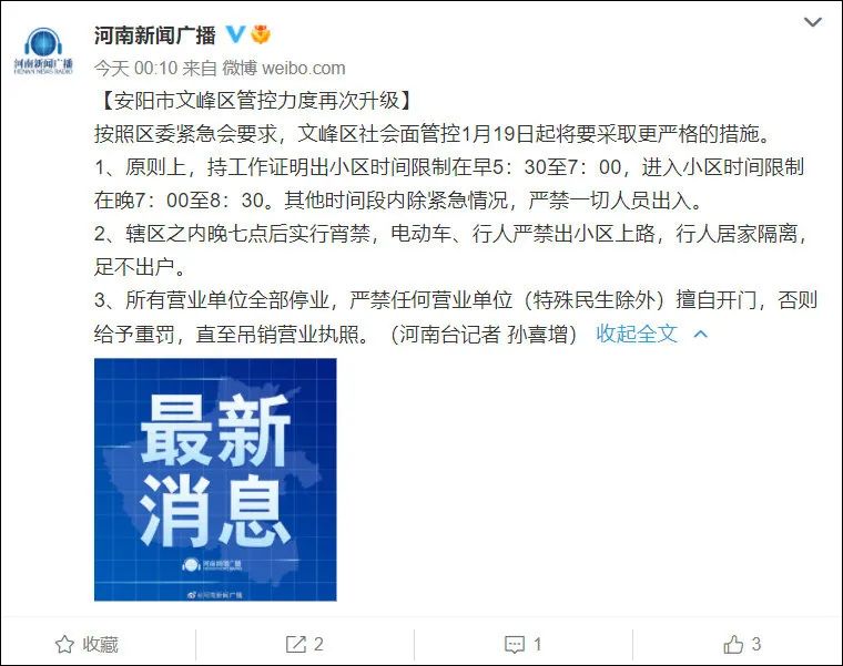 @河南新闻广播 1月19日消息,河南安阳文峰区晚七点后实行宵禁。