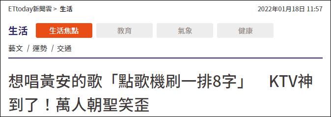 综合“ETtoday新闻云”、《镜周刊》等台媒1月18日报道,遇上此事的是一名黄姓网民,在其发现去KTV点播不了黄安的歌后,该网民便在18日凌晨,到脸书社团“爆废公社二馆”中发帖爆料此事。