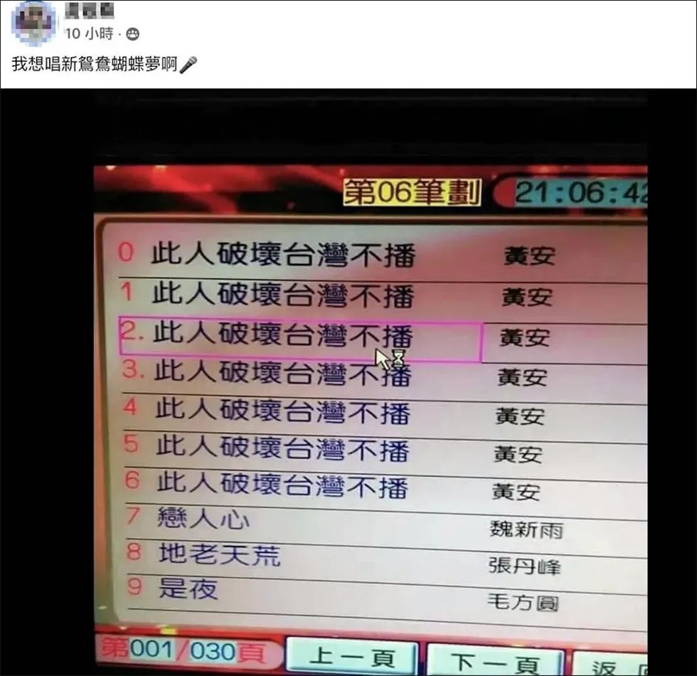 根据帖文,这名网民晒出了一张点歌机照片,其上清晰可见,唯独7首歌手为黄安的歌曲,没有显示歌名,而是直白标着“此人破坏台湾不播”8个大字。面对这一情况,该网民感慨道:“我想唱新鸳鸯蝴蝶梦啊!”