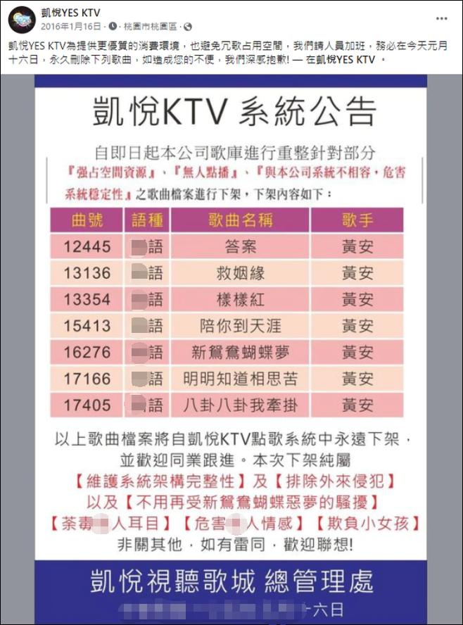 另有岛内网民查出,这是一家名叫“凯悦YES KTV”的连锁KTV。早在2016年1月16日,该店就在脸书粉丝团公告,称要将黄安的7首歌曲,《答案》《救姻缘》《样样红》《陪你到天涯》《新鸳鸯蝴蝶梦》《明明知道相思苦》《八卦八卦我牵挂》,从点歌系统上全数删除。