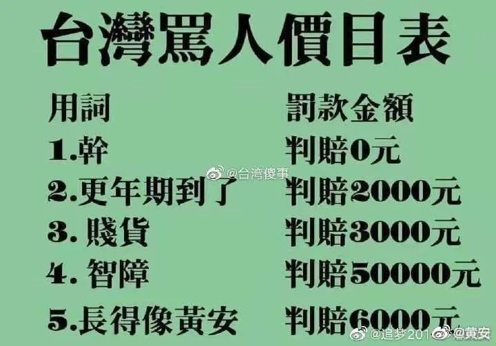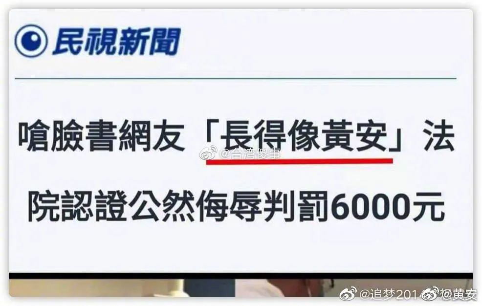 黄安一并给出更多“证据”,一是岛内电台“宝岛联播网”公告拒播黄安演唱歌曲的截图;二是岛内亲绿媒体“民视新闻”的一条报道截图,而该报道的标题是《呛脸书网友“长得像黄安”,法院认证公然侮辱判罚6000新台币》。
