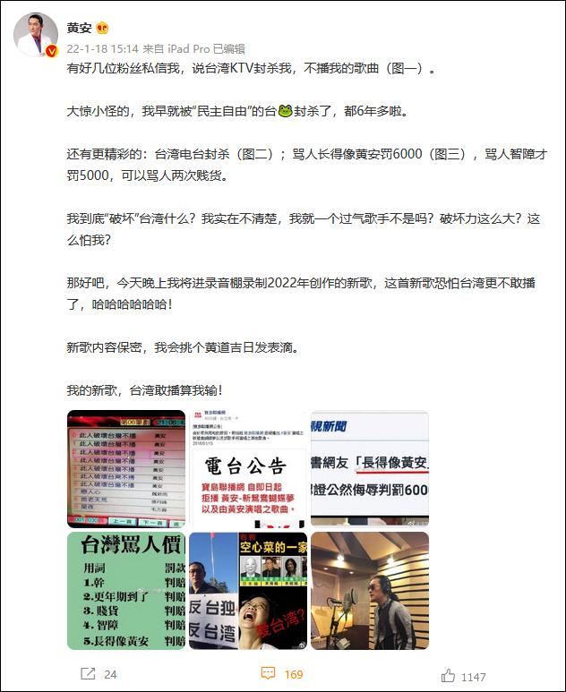 台湾歌手黄安则通过微博回应,自曝他早被岛内“封杀”,并贴出更多“证据”。他还称,他不过是一个过气歌手,不清楚自己“到底‘破坏’台湾什么”。