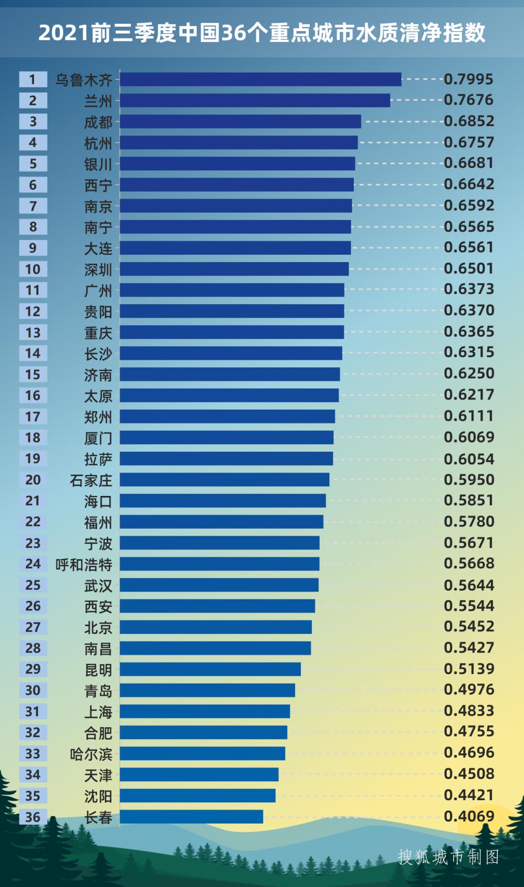 2021前三季度中国36个重点城市水质清净指数排名/搜狐城市制图