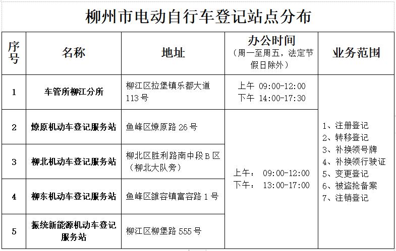 一、市民群众购买符合新国标的电动自行车后,可以到柳州市5家电动自行车登记站点办理电动自行车登记业务。