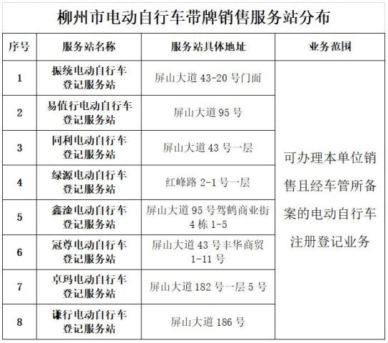 二、市民群众在柳州市8家电动自行车带牌销售登记服务站购买电动自行车,可享受购车、办理登记“一站式”服务。
