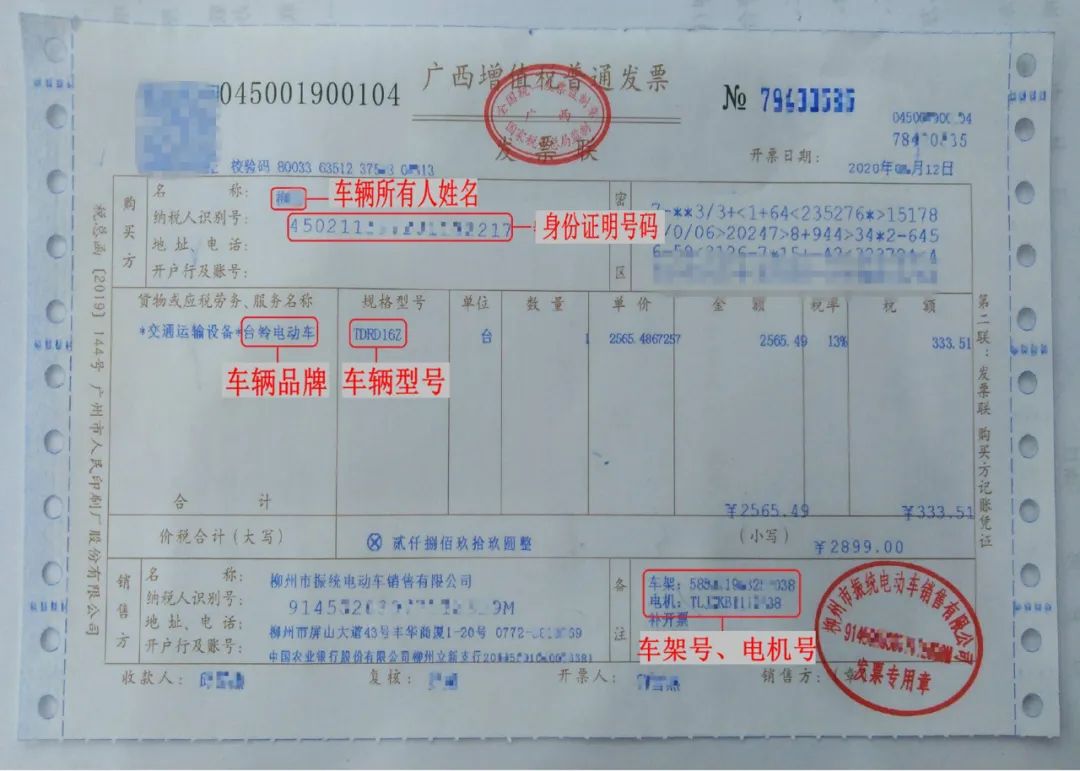 需要注意的是:办理电动自行车注册登记时,提交的发票须是计算机打印的增值税普通发票,且发票上需载明车辆的品牌型号、车架号、电机号以及车辆所有人姓名、身份证明号码等信息以确认车辆及车辆所有人信息,信息不全或与车辆、身份证明不一致的不予办理。