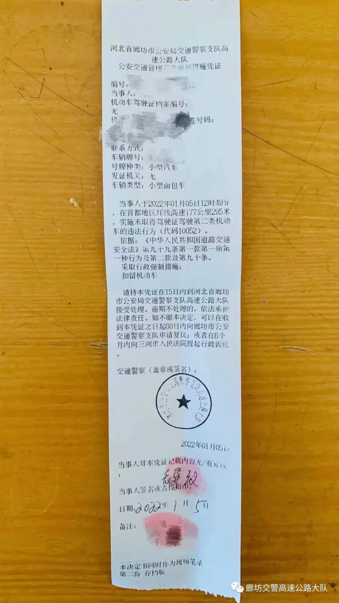 后因处于新冠肺炎疫情期间特殊要求,廊坊市公安局交通警察支队高速公路大队于1月15日依法将被处罚人邓某送至三河市拘留所执行行政拘留十日。