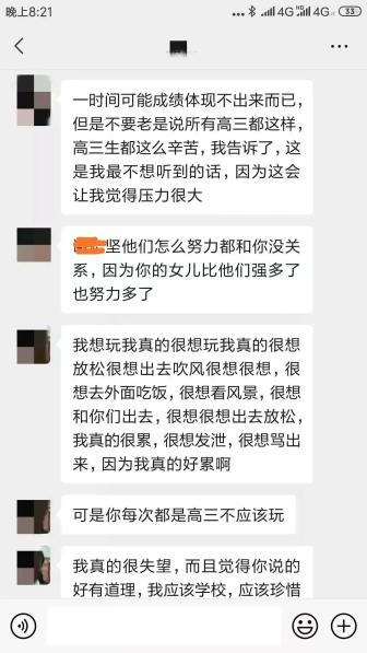 女儿说,自己知道高三要努力、要抓紧时间,但真的太累了,她想出去松松、出去吹吹风、去发泄、去骂出来。