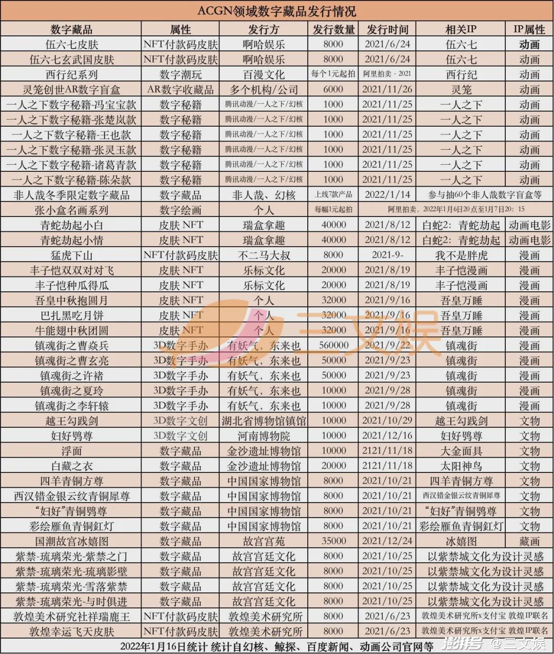 除了这些已上线的项目,《非人哉》《一人之下》等IP的数字藏品,也在腾讯幻核开启预热。所以,在文创新经济周刊写到第八期的时候,我们梳理了一下ACGN与文博IP推数字藏品的情况。