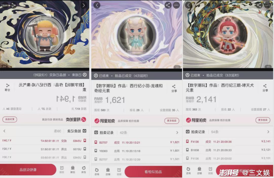 “个性化+爱好+潜在的可增值空间”,让这类限量发售的皮肤在市场上炙手可热。不久前,在阿里拍卖上线的数字潮玩西行纪系列多款产品,以1元起拍,经过及时轮出价拍出了上千元的价格。如西行纪小羽-龙魂和奇经元素落槌价1621元,西行纪三眼-哮天犬元素2141元,西行纪八戒-集气元素1941元。
